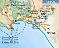 (Lunghezza: 95 km. circa. Itinerario nel Golfo di Gaeta, tra il mare, la collina e la montagna). GAETA, posta su un’appendice marittima dei monti Aurunci (penisoletta di Monte Orlando), su una costa in cui la natura offre ambienti diversi, fatti di belle spiagge e roccia, è una delle principali mete turistiche. Di origini antichissime, fu prima Repubblica marinara e, nel 1860-61, ultimo baluardo della monarchia borbonica. I segni più importanti dell’epoca romana sono nei pochi resti della marittima villa di Fonteo Capitone (spiaggetta di Fontana), nel grande mausoleo di Lucio Munazio Planco, nei pressi del Santuario della Trinità a Monte Orlando (area protetta facente parte, insieme all’omonima Oasi Blu marina, del Parco regionale Riviera di Ulisse), e nel Mausoleo di L.Sempronio Atratino. La città raggiunse il massimo splendore nel Medioevo, come testimoniano i numerosi edifici del quartiere di S.Erasmo: il Castello angioino-aragonese, il Duomo di S.Erasmo, le chiese di S. Giovanni a Mare, S. Domenico, S. Francesco, dell’Annunziata (con l’adiacente Grotta d’Oro), della Madonna della Sorresca, di S. Lucia e di S. Caterina. Menzione a parte meritano il citato Santuario della SS. Trinità con l’adiacente Grotta del Turco e la Montagna Spaccata, una fenditura che si sarebbe aperta nella roccia alla morte di Gesù. Da visitare inoltre: il Museo del Centro Storico Culturale nel palazzo dell’Annunziata e il Museo Diocesano. Da Gaeta si raggiunge FORMIA in circa 5 km. Posta al centro del Golfo, conserva testimonianze di epoca romana, essendo stata frequentato centro di villeggiatura balneare grazie alla mitezza del clima. Del periodo più antico la città conserva sparsi tratti di mura megalitiche, arcate dell’acquedottto romano (a Mola), i criptoportici della Villa Comunale, i resti di un vivaio ittico nel mare del porto, la privata Villa Rubino, in cui fu firmata la resa dei Borbonici ai Piemontesi nel 1861, e che sorgeva su una villa romana, di cui restano le strutture a portico, un grande cisternone romano, il porticciolo romano e borbonico di Caposele. Sull’Appia, lato Roma, si possono osservare la fontana romana detta di S.Remigio e la Tomba di Cicerone, situata al km.139,200. Nei nuclei antichi si trovano pregevoli opere: a Mola (mare) la torre di difesa del fortilizio trecentesco, la chiesetta di S.Maria di Ponza; a Castellone (mare e collina) l’antica chiesa di S.Erasmo, e quelle di S.Anna e di S. Maria la Noce. Importante è il Museo Archeologico Nazionale, alla base del palazzo comunale. Dalla zona marina, ci si sposta verso la collina e si giunge a MARANOLA, ai piedi del Monte Altino, in posizione dominante il mare. La località conserva un borgo medievale con resti di un castello con un’alta torre rettangolare e le chiese di S.Maria ad Martyres e di S. Luca. Una ripida strada carrozzabile conduce verso la cima del Monte Redentore (1250 m.), fino a 900 mt. Il monte è così chiamato per la presenza della statua che vi fu collocata nel 1901. Ai piedi, il Santuario rupestre di S. Michele Arcangelo. Si ridiscende e, dopo aver superato la frazione di Trivio, si raggiunge CASTELLONORATO che prende il nome da un castello fatto costruire da Onorato I Caetani, in posizione strategica sulla strada per Cassino. Ottima la visione sul Golfo. Si torna indietro fino a Formia, e di qui si segue la via Appia fino alla località S. Corce, da dove ci si dirige a SPIGNO SATURNIA, formato da due insediamenti: il nucleo originario Spigno Vecchio, oggi pressoché abbandonato, ma vissuto in estate, conserva, dopo le distruzioni dell’ultima guerra, resti del muro poligonale in località Campovivo e dell’antico castrum. Alle spalle si erge il monte Putrella, la cima più alta degli Aurunci (1553 m.), che alimenta sorgenti che danno acqua ai centri vicini: la principale è quella di Capodacqua. Tra gli edifici religiosi, la Chiesa di S.Croce. A valle, sul bordo della superstrada Formia-Cassino, sorge Spigno Nuovo. Lasciato il piccolo centro, si torna sulla via Appia e dopo pochi km si raggiunge l’abitato di SCAURI in comune di Minturno. Scauri è, insieme a MARINA DI MINTURNO, l’area balneare che si svolge sull’ampio lungomare compreso tra i monti d’Oro e d’Argento, sui quali si individuano i resti di torri. A Scauri si osserva un tratto di mura poligonali. Dal Monte d’Oro inizia l’area protetta di Giànola-Monte di Scauri, con l’omonima Oasi Blu, facenti parte del Parco regionale della Riviera di Ulisse. Proseguendo verso l’entroterra si giunge a MINTURNO il cui centro storico, raccolto attorno a corso V. Emanuele, conserva importanti monumenti come il Castello baronale, il Palazzo municipale (ex-convento), la duecentesca Chiesa collegiata di S. Pietro e quelle di S. Francesco e dell’Annunziata. Da visitare la Mostra del costume minturnese e del mondo agricolo Il territorio di Minturno si estende fino al confine meridionale della provincia di Latina, segnato dal fiume Garigliano, attraversato da un ottocentesco ponte borbonico a catene, che conduce in provincia di Caserta. In quest’area sorge il comprensorio archeologico di Minturnae, che comprende un tratto della via Appia romana, i resti del Foro repubblicano e del Foro imperiale, un edificio termale, il macellum, il teatro (sede di rassegne estive), un antiquarium. Accanto alla città romana si trova il Cimitero militare britannico della II guerra mondiale; e, sull’altro lato della strada, i resti di un acquedotto romano. Graziose le frazioni collinari di S. Maria Infante, Pulcherini e Tufo. Da Minturnae, proseguendo verso l’entroterra, si giunge in circa 10 km. a SS.COSMA E DAMIANO, paese collinare che forma un agglomerato unico con il confinante comune di Castelforte, in posizione dominate la pianura del Garigliano. Degli antichi edifici, quasi tutti distrutti dai terribili bombardamenti della 2^ Guerra Mondiale, sono da ricordare il palazzo Tibaldi, la Chiesa dei SS.Cosma e Damiano e di S.Lucia